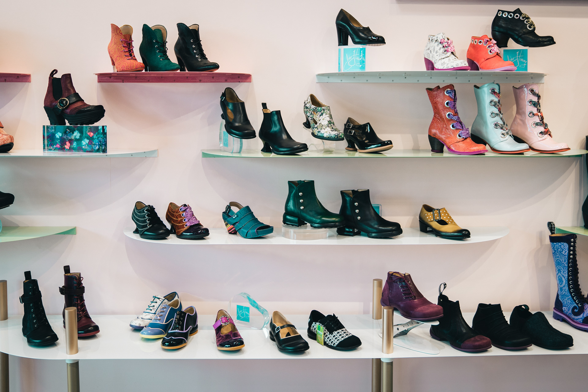 This store incorporates art depicting key moments in John Fluevog's career and custom fixtures inspired by his love of cars, art and curves.
